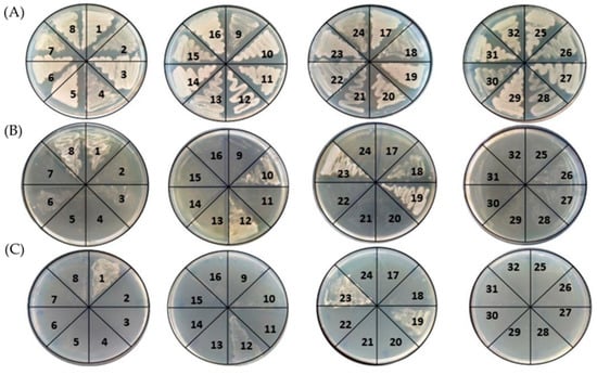Seventy-five yeast isolates were isolated from 15 samples of lychee at Thua Thien Hue. They were preliminarily screened on YMA supplemented with 4% (v/v) ethanol at 35 °C according to Limtong et al. (2007) []. Thereafter, all of them were examined for their ability to grow on YMA at 37, 40, and 45 °C. The results indicated that 32 isolates (H1–H32) of the yeasts grew well at 37 °C (Figure 1A), of which seven isolates could grow at 40 °C (Figure 1B). Four isolates could grow at 45 °C, and 12 exhibited poor growth, whereas three isolates (H1, H19, and H23) could grow well at this high temperature (Figure 1C). Our results are in line with those previous studies, in which thermotolerant yeasts could grow from 37 °C to 45 °C [,,] and even up to 50 °C []. As a result, the seven isolates that grew at 40 °C were chosen to further examine bioethanol production.