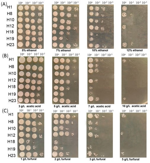 Concerning furfural stress, the growth of all selected isolates in the presence of 1 g/L furfural was remarkably similar, except for isolate H18 (Figure 2C). The growth performance of the isolates (H18, and H19) was significantly decreased when the plates contained 2 g/L furfural; others were not affected much at this dose of furfural. Increasing the furfural concentration in the medium to 3 g/L resulted in severely affected the growth of four isolates (H8, H10, H18, and H19). On the other hand, three isolates (H1, H12, and H23) could grow even at 5 g/L. Our results indicated that the selected isolates are more tolerant to furfural than some industrial S. cerevisiae []. In general, Figure 1 indicated that isolates H1 and H23 showed better growth than other isolates in ethanol, acetic acid, and furfural stress conditions.