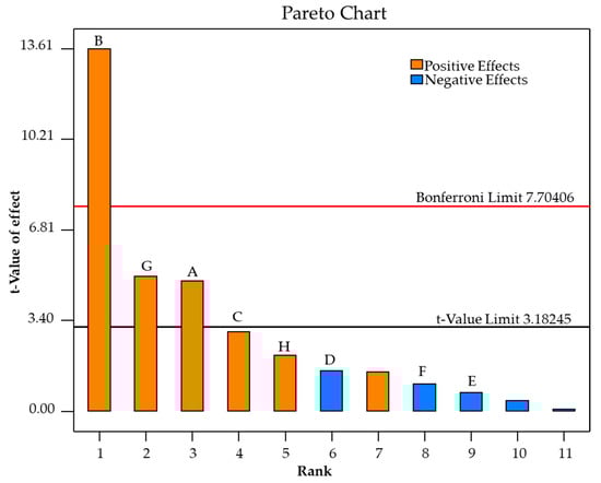 Pareto chart exhibiting effects of (NH4)2SO4 (A); Substrate concentration (B); ZnSO4.7H2O concentration (C); MgSO4·7H2O concentration (D); MnSO4·H2O concentration (E), KH2PO4 concentration (F); initial pH (G) and CaCl2. 2H2O (H) on bioethanol production from substrate-based SCB hydrolysate.