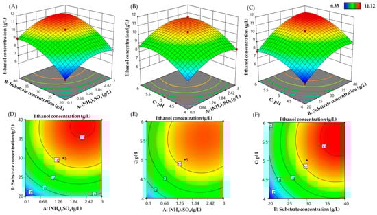 Response surface plot and related contour plot displaying the simultaneous effects of (NH4)2SO4 andsubstrate concentration (A,D); (NH4)2SO4 and initial pH (B,E); substrate concentration and initial pH (C,F) on ethanol production.