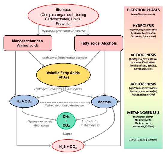 During anaerobic digestion, a number of synergistic reactions between microbial consortia degrade and convert organic feedstocks into biogas. The process includes four main phases, namely hydrolysis, acidogenesis, acetogenesis, and methanogenesis (Figure 2), with specific microbial communities belonging to acidogenic, acetogenic, and methanogenic microbes. During the hydrolysis phase, high molecular weight organics (e.g., lipids, carbohydrates, and proteins) are first hydrolysed into smaller building units (i.e., fatty acids, glucose, and amino acids) by the action of acidogenic bacteria. The produced small molecules are further degraded by acidogenic bacteria into volatile fatty acids (VFAs) and other by-products such as CO2, H2S, and NH3. VFAs are further digested during the acetogenesis phase by the action of acetogenic bacteria to produce H2, CO2, and acetate. Finally, methanogenic archaea utilize these intermediates during methanogenesis to produce biomethane and other gases [37].