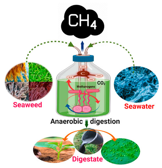 Currently, anaerobic digestion for biogas production is proposed as a promising renewable energy technology for mitigation of climate change by reducing the reliance on fossil-based fuels [19,20]. A wide range of wastes, including municipal and industrial wastewater, energy crops by-products, livestock waste, and food wastes, can be treated using this technology with triple purposes of energy recovery, soil improvement, and waste management. Compared to many other waste treatment processes, anaerobic digestion technology offers significant advantages (Figure 1). Biogas is the main product of this process as an energy product, while digestate is a by-product rich in nutrients and can be utilized as a soil fertilizer [21]. Among different biogas feedstocks, lignocellulosic biomass represents exciting characteristics for biofuels and other interesting products through a lignocellulosic biorefinery concept. It offers waste reuse, increases process efficiency, and reduces the environmental damage by integration of waste management, energy recovery, and valuable products generation [22,23]. Anaerobic digestion of lignocelluloses has received increasing attention in recent years. However, lignocellulosic biomass is composed mainly of hemicellulose, cellulose, and lignin, having many challenges for direct anaerobic digestion due to crystallinity, heterogeneity, and high polymerization degree of the biomass [24,25,26]. Efficiency of hemicellulose and cellulose de-polymerization to form sugars and lignin degradation are the main challenges for successful anaerobic digestion of lignocellulosic materials [27,28]. Therefore, biomass pretreatment could improve biodegradability and biomethane production of lignocellulosic biomass. It is essentially needed to remove lignin, expanding the fibers, and increase the accessible surface area of anaerobic microorganisms [28,29]. However, this step is energy intensive and highly costly, compromising the feasibility and sustainability of the process [30,31]. In addition to the aforementioned challenges, collateral flows such as excessive use of arable land, chemicals, or fresh water result in severe impacts on the environment [32]. Therefore, exploring new feedstocks to avoid competition for the available resources is of great importance. In this context, the estimated biomass productivity of seaweed is relatively higher (≈26 tons dry weight per hectare per year, compared to 2.3 tons for soya and 5.1 tons for corn). Seaweed also has high adsorption capacity that can be used for preservation of a healthy marine ecosystem and wastewater treatment through phycoremediation [28,33,34]. It can be used for anaerobic digestion, where seawater/wastewater is utilized instead of fresh water.