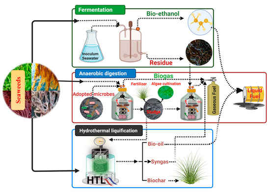 Sequential energy recovery is another aspect that has been discussed recently to enhance the efficiency of biomass conversion (Figure 5). The strategy of sequential or co-production of biofuels could enable the complete utilization of seaweed biomass for enhanced biofuel production. Co-production of biofuels is carried out based on biochemical composition in which biofuels are produced sequentially. For instance, carbohydrate-rich seaweed could be used for sequential biohydrogen and biomethane production, collectively called hythane. The potential of Ulva reticulata for hythane production was studied to increase the disintegration potential through chemo-mechanical pretreatment. The pretreatment enhanced the biomass disintegration, induced liquefaction at a minimum specific energy of 437.1 kJ/kg TS, and resulted in higher hydrogen production of about 63 mL H2/g COD [122]. In addition, S. latissima was evaluated for consequent biohythane generation and showed an improved solubilization trend with enhanced biomethane production to 345.1 mL/g VS, and the maximum energy conversion efficacy of 72.8% was achieved after two-stage biohythane production [123].