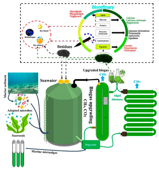 Recent studies discussed the marine biorefinery system through fermentation and bioethanol production [35,36], while there is a gap in the literature for evaluation of biogas production using marine resources. Therefore, intensive investigation for designing a feasible biorefinery approach for biogas production using marine resources is a timely topic. The present review article aims to provide an overview of the recent research on anaerobic digestion of marine biomass (seaweed) using seawater and marine microorganisms for biogas production. The strategies to enhance biomethane production from seaweed through liquid co-substrates, and the addition of external additives to the digestion system to promote the microbial communities are discussed. In addition, the potential of introducing marine microalgae to the system for achieving a zero-waste integrated approach is highlighted.