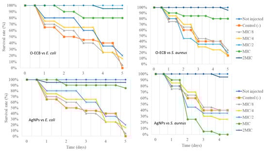 3.5. Toxicity Screen and In Vivo Antibacterial Activity of AgNPs and O-ECB