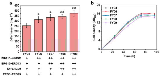 The “push–pull” strategy has become a common approach in metabolic engineering to increase the metabolic flux of targeted synthetic pathways and improve target compound titers [,]. Considering that there may still have been excess cytosolic acetyl-CoA in the current strain, we performed additional overexpression of eight genes in the mevalonate pathway. Specifically, the eight genes were divided into four groups and integrated iteratively into strain FY03 under the control of strong constitutive PTEFin promoter or PEXP1 promoter (ERG10+tHMGR, ERG12+ERG13, IDI+ERG20, ERG8+ERG19), resulting in strains FY06–FY09, respectively. It has been verified that ERG10, HMGR, IDI, and ERG20 are particularly important for terpene synthesis among all MVA pathway genes [,,]. Thus, these four genes were divided into two groups and were controlled using the TEFin promoter, which is the strongest natural constitutive promoter in Y. lipolytica []. ERG12, ERG13, ERG8, and ERG19 were divided into another two groups under the control of strong constitutive EXP1 promoter. As shown in Figure 3a, production of β-farnesene gradually increased with the integration of additional MVA pathway genes. Specifically, additional overexpression of ERG10 and tHMGR in FY06 resulted in a β-farnesene titer of 315 ± 28.6 mg L−1, which was 23% higher than that of FY05. The ERG10 gene encodes acetylacetyl-CoA thiolase, which is the first step in the MVA pathway, and pulls cytoplasm acetyl-CoA into the β-farnesene synthesis pathway. Elevated expression levels of ERG10 and tHMGR have significant effects on β-farnesene synthesis. FY07 (additional ERG12 and ERG13) produced a β-farnesene titer of 335 ± 31.3 mg L−1, representing a 6.3% increase compared to FY06. Additional overexpression of ERG12 and ERG12 led to only a 3.4% increase in β-farnesene in FY08 (346 ± 17.9 mg L−1) compared to FY07, while the β-farnesene titer of FY09 (additional ERG8 and ERG19; 377 ± 29.7 mg L−1) was further increased by 5.9% compared to FY08 (Figure 3a).