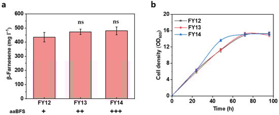 Compared with strain FY09, additional expression of two copies of tHMGR led to a 6.8% increase in β-farnesene titer in strain FY10 (395 ± 29.6 mg L−1), while additional expression of two copies of nadh-HMGR further increased β-farnesene production by 14.9% in strain FY11 (425 ± 21.5 mg L−1). FY12 showed the best improvement in β-farnesene titer among the three HMGR-enhanced strains (18.7% increase), with overexpression of one copy each of tHMGR and nadh-HMGR, resulting in a final β-farnesene titer of 439 ± 29.3 mg L−1 (Figure 4a). The results indicate that overexpression of NADH-dependent nadh-HMGR played a positive role in further enhancing β-farnesene synthesis. There was no significant difference in growth status among the experimental strains, suggesting that the expression of high-copy number NAD(P)H-dependent HMG-CoA reductase did not cause a cellular metabolic burden (Figure 4b). According to the copy composition of HMG-CoA reductase in FY12, the optimal strain, the combination of three copies of tHMGR and one copy of nadh-HMGR was found to be the most beneficial to make full use of intracellular precursors and co-factors for β-farnesene synthesis.