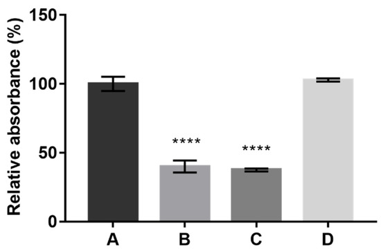 Relative absorbance (%) obtained from the sum of the absorbance values at the three wavelengths (400, 470, and 500 nm) after 12 days of fermentation under submerged fermentation conditions, using the culture media A, B, C, and D. Values are the mean ± SD (n = 3). Statistical analysis was performed by one-way ANOVA using Tukey’s multiple comparisons test (**** p < 0.0001).