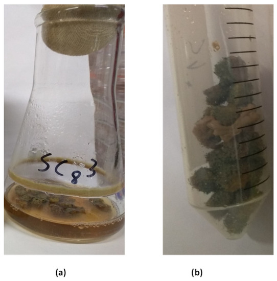 Color of biomass obtained under submerged fermentation conditions with mycelium immobilization on nylon sponge: (a) culture medium D after 5 days; (b) inert support (12 days) after culture medium filtration.