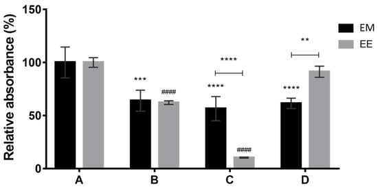 Relative absorbances (%) obtained from the sum of the absorbance values at the three wavelengths (400, 470, and 500 nm) determined for the extracellular medium (EM) and ethanolic extract of the biomass (EE) in each culture media (A–D) under submerged fermentation conditions with immobilized mycelium on an inert support, after 12 days. Values are the mean ± SD (n = 3). Statistical analysis was performed for culture medium samples, ethanolic samples, and between each other by two-way ANOVA (** p < 0.01, *** p < 0.001, **** p < 0.0001 and #### p < 0.0001).