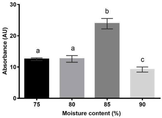 Evaluation of moisture content (% w/w) for solid-state fermentation using an inert support, and the culture medium A. Values are the mean ± SD (n = 3). Statistical analysis was performed by one-way ANOVA. Bars with different letters are significantly different (p < 0.05) while the same letter indicates no statistical difference.