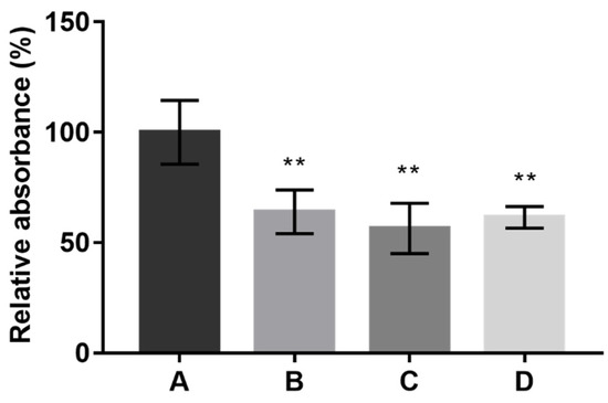Relative absorbance (%) obtained from the sum of the absorbance values at the three wavelengths (400, 470, and 500 nm) after 12 days of fermentation under solid-state fermentation using an inert support, and culture media A, B, C, and D. Values are the mean ± SD (n = 3). Statistical analysis was performed by one-way ANOVA (** p < 0.01).
