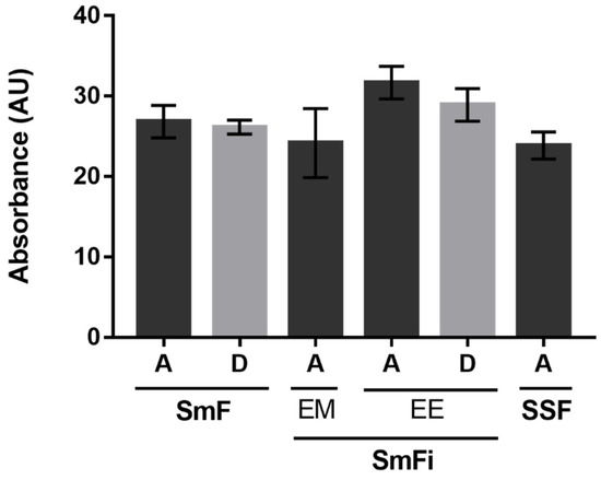 Values of absolute absorbance obtained from the sum of the absorbances measured at 400, 470, and 500 nm for the best conditions found under the three studied types of fermentation. (SmF) submerged fermentation; (SmFi) submerged fermentation with mycelium immobilization; (SSF) solid-state fermentation; (EM) extracellular medium; (EE) ethanolic extract of the biomass; (A) synthetic medium (dark grey); and (D) alternative medium containing cheese whey and corn steep liquor (grey). Values are the mean ± SD (n = 3). Statistical analysis was performed by one-way ANOVA.