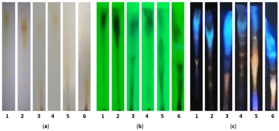 Silica gel TLC showing the separation of the pigments mixtures obtained from the best conditions selected for the comparative analysis: 1—culture medium A under SmF; 2—culture medium D under SmF; 3—extracellular medium (EM) obtained using culture medium A under SmFi; 4—ethanolic extract (EE) obtained using culture medium A under SmFi; 5—ethanolic extract (EE) obtained using culture medium D under SmFi; and 6—ethanolic extract (EE) obtained using culture medium A under SSF. (a) TLC photographed under visible light; (b) TLC exposed to UV light at 254 nm; and (c) TLC exposed at 366 nm.