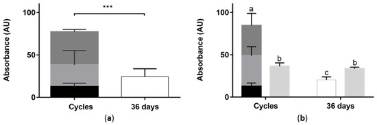 Absolute absorbance obtained for (a) free mycelium (SmF) and (b) immobilized mycelium on inert support (SmFi) with culture medium change (Cycles), and without culture medium change (36 days). For culture medium change, the absorbance from the first (black), second (gray), and third (dark gray) cycles of 12 days was represented together with the value obtained for 36-days fermentation (white). The ethanolic extract obtained at the end of 36 days (cycles and extended batch) under SmFi is represented by light gray bars. Values are the mean ± SD (n = 3). Statistical analysis was performed between cycles, and between Cycles and 36 days by one-way ANOVA. (a) *** p < 0.001); (b) bar graphs which have the same letter are significantly equal therefore p is not bellow 0.05. On contrary, different letters are significantly different from each other (p < 0.05).