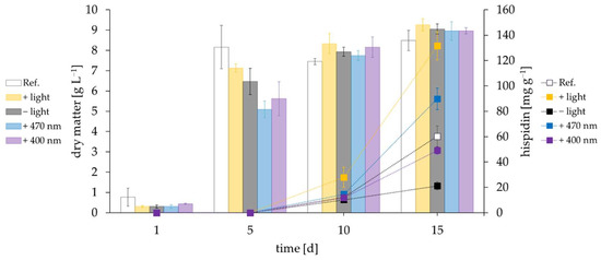 I. hispidus was cultivated under different light conditions. Changes in irradiation slightly delayed biomass production compared to the control setup (incubator with windows, but without extra illumination), but had no effect on the final dry matter concentration of about 9 g·L−1 after 15 days of cultivation (Figure 1). Hispidin generation started around day 10, when biomass production ceased. Pigment yields were dramatically reduced in the dark. Illumination with λ = 400 nm restored them to roughly the same amount as under control conditions (49.1 and 60.2 mg·g−1, respectively). An increase of about 50% on day 15 was obtained by illumination with 470 nm (89.8 mg·g−1), and white light more than doubled the yield to a final 131.6 mg·g−1 hispidin.