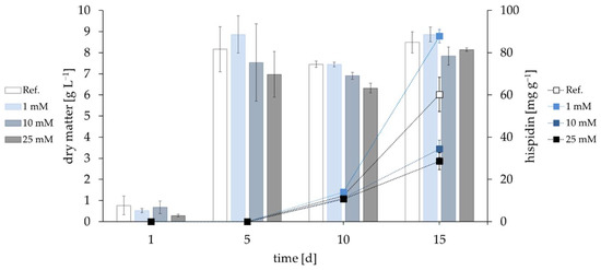Different concentrations of hydrogen peroxide were added either daily (1 mM) or once on day 4 to determine the influence of oxidative stress. Both 10 and 25 mM slightly reduced biomass generation (Figure 2). As seen before (Figure 1), pigment generation started again on day 10. The single dosages of H2O2 decreased the hispidin yield on day 15, but daily addition of 1 mM H2O2 increased the yield by 45% up to 87.8 mg·g−1 when compared to the control.