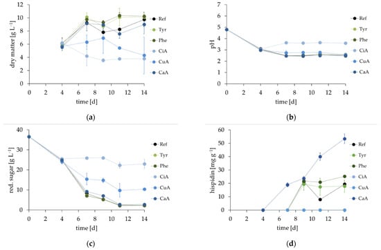 Cultures supplemented with l-tyrosine, l-phenylalanine, and caffeic acid showed no significant differences to the reference (Ref.) regarding biomass generation, pH, or consumption of reducing sugars. All of them reached final dry matter concentrations of around 10 g·L−1. l-Phenylalanine slightly raised pigment yield to 25.2 mg·g−1 on day 14 compared to the control (19.4 mg·g−1). Caffeic acid enhanced pigment synthesis significantly, yielding 53.4 mg hispidin per gram dry matter on day 14.