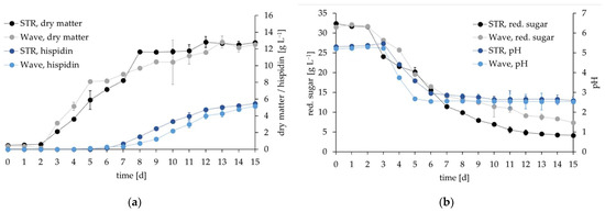 Initially, the mycelium grew slightly better in the wave as indicated by the higher biomass and lower pH around day 4, but this was not reflected by the consumption of reducing sugars (Figure 4). From day 7 on and, thus, during the active synthesis of hispidin, the STR showed slightly quicker biomass and hispidin generation. Both reactor types reached similar final concentrations of 12.8 and 12.6 g·L−1 dry matter, and 5.5 and 5.2 g·L−1 hispidin for the STR and wave, respectively (Figure 4a). The slightly better growth in the STR matched the more pronounced decrease in the content of reducing sugars (Figure 4b). In comparison to shake flask cultivations (9 to 10 g·L−1, Figure 1 and Figure 2), the cultivation in both bioreactors led to a slight increase of the final biomass (>12 g·L−1). The hispidin yields were significantly improved: The g·L−1 data indicated in Figure 4a correspond to 428.5 (STR) and 410.9 mg hispidin·g−1 dry matter (wave), respectively, an increase by a factor of seven compared to the control (Figure 1 and Figure 2) and by a factor of three compared to the best single-parameter change in shake flasks, with full illumination (Figure 1). Both biomass and hispidin generation kinetics were comparable to those observed in the shake flasks.