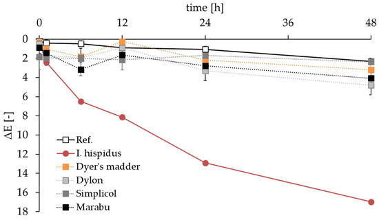 An accelerated light stability test was performed in triplicate with dyed silk. Samples were dyed with I. hispidus culture broth and tested against silk samples dyed with Dyer’s madder (WEJA Färbeset Resedgelb, Livos Pflanzenchemie, Germany) and commercially available textile dyes (Simplicol Textilfarbe expert–Mais Gelb, Brauns-Heitmann GmbH & Co. KG; Marabu Easy Color gelb, Marabu GmbH & Co. KG; Dylon Sunflower Yellow, Henkel AG & Co. KGaA, Germany). Samples were prepared by heating 100 g of silk or wool at 90 °C for 1 h in the respective liquor. Samples were not treated with mordants or fixing agents other than those present in the commercial products. The samples were radiated for 48 h with 400 W·m−2 at 15 °C in an Atlas Suntest XLS+, equipped with a Xenon lamp and window glass filter (Atlas Material Testing Technology GmbH, Linsengericht-Altenhaßlau, Germany). The color was measured after 1, 6, 12, 24, and 48 h with a Konica Minolta CM-600d (Geometry 8°, measurement area 8 mm, reflection mode, specular component excluded) and analyzed with the program Colibri, version 3.8.12. The given ΔE values, as defined by the International Commission on Illumination, reflect the color difference of a sample (tx) compared to a reference (t0). For documentation, pictures were taken with a Canon EOS 800D with an 18–55 mm EF-S zoom lens, in a PackshotStart Mark II (Sysnext, Levallois-Perret, France) (see Table S1).