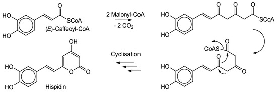 Proposed biogenesis of hispidin in I. hispidus after [2]. Caffeic acid is elongated by two molecules (malonyl-CoA) with the release of carbon dioxide. After cyclization, the target molecule hispidin is formed. A detailed portrayal of the proposed pathways can be found in Lee and Yun (2011).