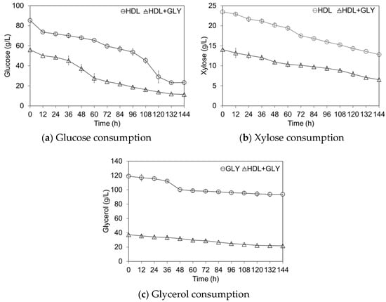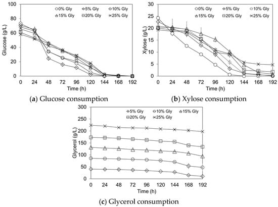 Glycerol use notably appeared unaffected by high substrate concentration, except at a very high concentration, with 25% glycerol mixed with the hydrolysate. The profiles in Figure 7c showed an almost identical trend in glycerol use. Although simultaneous glycerol use to sugar use was evident, the use rate (as indicated by the slopes) was faster when sugars were depleted or near depletion.