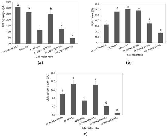 Cell dry weight (a), lipid content (b), and lipid concentration (c) when culturing R. glutinis TISTR 5159 in bagasse hydrolysate with different C/N molar ratios obtained by adding yeast extract. Different letters above the bars indicated significant differences in mean values at 95% confidence level.