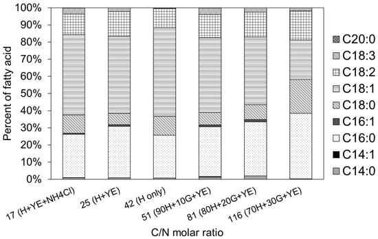 Fatty acid profiles when culturing R. glutinis TISTR 5159 in media with different C/N molar ratios based on addition of nitrogen sources (YE/NH4Cl) or glycerol (G), where the central value (42) represents C/N in the hydrolysate (H). Numbers in front of the letters indicate the mixing volume ratio of the hydrolysate and glycerol in the media.