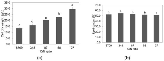 The results in Figure 4a show increases in cell growth with decreasing C/N molar ratio (more nitrogen added). The highest biomass of 29.64 ± 1.61 g/L resulted in a medium with a C/N ratio of 27. The lipid contents remained relatively unchanged over the range of the C/N ratios used in this study, where the values were between 51.62 ± 0.87%–54.61 ± 0.71% (Figure 4b). As a result of high biomass and lipid content, the highest lipid production was at a C/N ratio of 27, where the lipid obtained was 15.17 ± 0.60 g/L (Figure 4c).