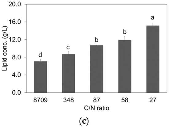 The results of this part of the study contradict those reported by many studies. High lipid accumulation generally occurs in media with high C/N ratios for many oleaginous yeasts, including Trichosporon dermatis 32903, Rhodosporidium toruloides DSMZ 4444, Lipomyces starkeyi where the values of the ratios ranged between 72 and 140 [,,]. Regardless of the general suggestion of high lipid accumulation under high-C/N conditions, our results concurred with another report using R. glutinis BCRC 22360 cultivated under a C/N of 30, where 58.5% lipid accumulation occurred [].