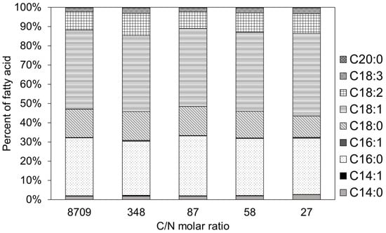 This experiment was designed such that the medium’s C/N ratio was the same, at 42, by considering the nitrogen content in the hydrolysate (In + Ex in Table 2). We expected the lipid accumulation to be the same, as a result of the similar C/N ratio. Due to these unanticipated results, we recalculated the C/N ratio based only on the external nitrogen source supplied (Ex in Table 2). The results were as expected: lipid accumulation (content) increased with increasing C/N ratio [,,]. In addition to high lipid accumulation, high cell growth was another requirement in producing lipids at high concentrations. Enough nitrogen sources were essential for growth []. Separate experiments in the next section investigate the effects of the C/N ratio, both accounting for and not accounting for nitrogen in the hydrolysate.