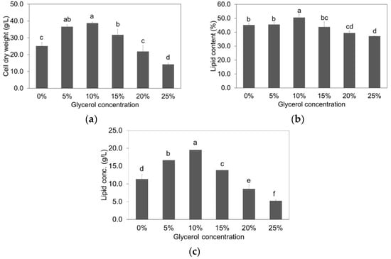 The results in Figure 6 demonstrated that adding glycerol to increase the carbon source concentration improved the growth and lipid production by the yeast. The lipid concentration increased from 11.35 ± 1.27 g/L with no glycerol to 16.65 ± 0.00 g/L and 19.57 ± 0.53 g/L when the hydrolysate was mixed with 5% and 10% v/v of glycerol. However, the hydrolysate mixed with over 10% v/v of glycerol worsened lipid production (Figure 6c). The decrease in lipid production was the combined result of lower cell growth and lipid content in the cell, as demonstrated in Figure 6a,b.