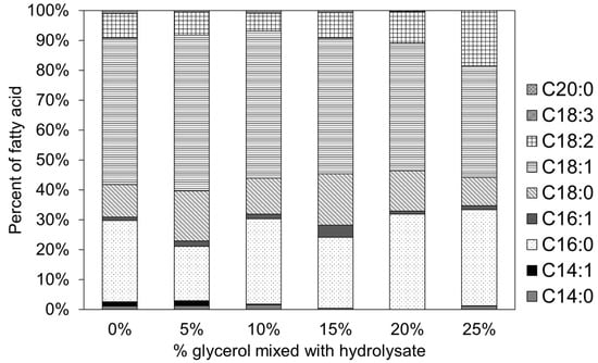 The fatty acid content of the lipid produced in different media (Figure 3) showed similar profiles when hydrolysate was the sole carbon source, with oleic acid (C18:1) being the major fatty acid. With added glycerol, more stearic acid (C18:0) was produced, with a lesser fraction of oleic acid present. Linoleic acid (C18:2) increased slightly as glycerol fraction increased.