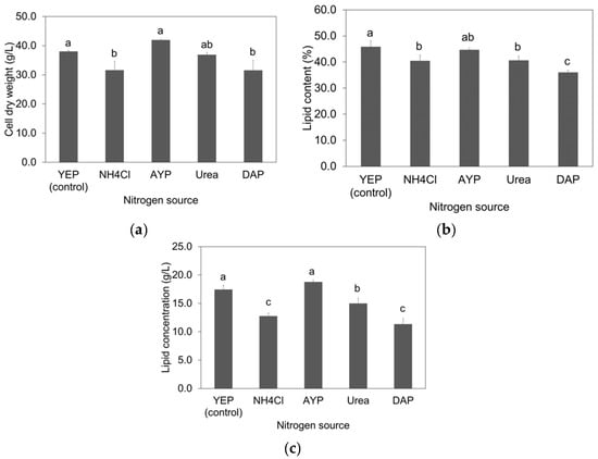 Regardless of the lower cost per gram of lipid when using urea as the nitrogen source, we selected the AR-grade yeast extract as the promising nitrogen source. The reason for choosing AR-grade yeast extract was that there could be a future replacement of this nitrogen source. With the promotion of a bio- and circular economy, waste yeast from breweries or bioethanol plants could be reused or even made into yeast extract to replace AR-grade yeast extract.
