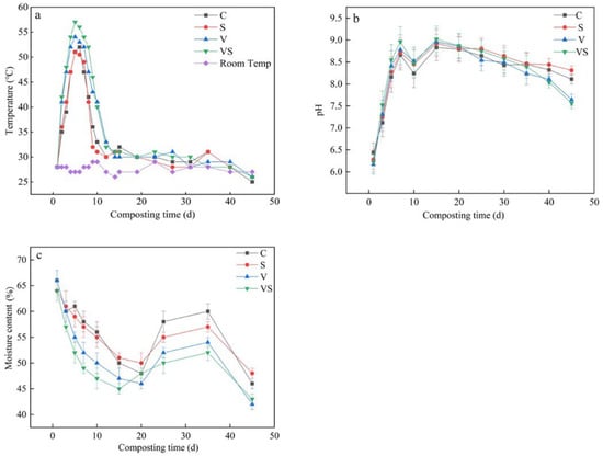 Temperature is one of the most important parameters during the mature process of compositing substrate. Generally, the compositing process could be divided into mesophilic phase, a thermophilic phase, and mature phase in terms of temperature change. In detail, the continuous thermophilic phase can effectively inactivate pathogenic bacteria and parasites, and promote the degradation of macromolecules such as cellulose and lignin. The temperature changes in the composting process of each group are shown in Figure 1a. Within 48 h after the initiation of composting, each experimental group was rapidly heated, and then entered the thermophilic period. The maximum temperatures of the V and VS groups were significantly higher than those of the C and S groups, indicating that the vigorous metabolism of microorganisms in the thermophilic phase could consume a large amount of oxygen. Meanwhile, the thermophilic durations of the ventilation groups (V and VS) were also longer than those of the other two groups, indicating that the macromolecular organic substances such as cellulose and lignin in the substrate were not completely decomposed as compared to the effect of forced ventilation. Forced ventilation could enhance the activity of thermophilic microorganisms and increase the degradation efficiency in the thermophilic phase. As shown in Figure 1a, the thermophilic phase of various compost samples lasted for 7–9 days, which was a sufficient time to fully reach the hygienic standard. During the mature phase, due to the consumption of the substrate, the reactor could not maintain most heat, resulting in a significant temperature decrease. In the meantime, the thermophilic microorganisms became active again. The experimental cycle took place in late spring, and the room temperature was maintained at approximately 27 °C. The stack temperature of the V groups (V and VS) was slightly lower than that of the C group and S group, indicating that in the mature phase, the ambient ventilation could facilitate the oxygen consumption of the composting microorganisms, while the forced ventilation accelerated the heat loss and further reduced the stack temperature. If the ambient temperature was low in autumn and winter, then the ventilation might remove a large amount of heat during the cooling stage, thereby affecting the ripening efficiency. In each group, mesophilic phase was the composting cycle that was not affected by ventilation. At this phase, microorganisms adapted to the environment, and degradable organic matter such as saccharides and low-molecular-weight proteins were preferentially decomposed by these microorganisms. Due to the large number of miscellaneous bacteria in environmental samples, the demand for oxygen had not been selected by the composting process, and thus ventilation had little effect on the rapid temperature rise at this stage. Compared with the sufficient oxygen and heat dissipation brought by forced ventilation, an appropriate C\N ratio and moisture content had greater impacts on microbial metabolism in the mesophilic phase.