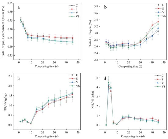 Total organic carbon (TC) is the total amount of organic matter represented by the content of carbon. As shown in Figure 2a, the TC of each experimental group showed a downward trend as a whole, and tended to be stable in the later stages. The TC decreased rapidly in the early stages, and then increased slightly after entering the thermophilic phase. In the mesophilic phase, the reactor was rich in degradable organic matters, and microbial metabolism was more active with abundant substrates. In the thermophilic phase, there were decompositions happening to macromolecular organic matters such as lignin and cellulose. The viable microbial species were relatively few, leading to the reduction of reduction rate. After the temperature dropped, the compost entered the mature phase. Although the temperature was again suitable for the metabolism of various microorganisms, the decomposition rate of the TC was still slow, due to the inactivation of a large number of miscellaneous bacteria in the thermophilic phase. After 45 days of composting treatment, the organic matter content of the C group and VS group decreased from 75.34% and 75.22% to 64.51% and 62.59%, respectively. The organic matter of the experimental group decreased significantly, and the metabolism of microorganisms was more vigorous, indicating that good ventilation was conducive to the degradation of substrate organic matter. Science it was necessary to add external bacteria to speed up the composting rate, it could be added in the mature phase to improve the ripening effect.