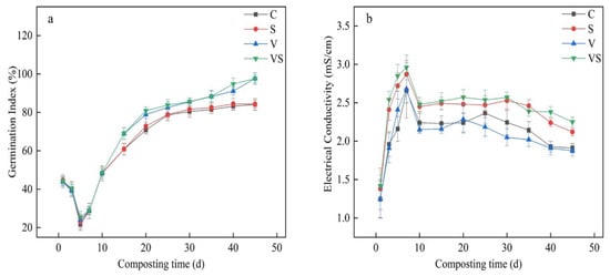 When the seed germination index (GI) was above 50%, the material could meet the basic requirments of plant growth, while GI upper to 85% indicated that the fertilizer pile has been completely decomposed [,]. Figure 3a illustrated that during the mesophilic phase of composting, the GI of each group of samples was less than 50%, indicating that the samples could not yet meet the nutritional and sanitary needs of plant growth. The content of organic macromolecules in litter was high. Municipal sludge was rich in nutrients, but it could not be used without treatment, probable due to the presence of miscellaneous bacteria. With the composting process, the GI of each group of samples decreased significantly in the thermophilic phase, indicating that the composting products in the thermophilic phase could not meet the needs of crop growth. In the mesophilic phase, low-molecular-weight organic compounds were rapidly consumed via degradation by microorganisms. After entering the thermophilic phase, the dominant microorganisms in the fertilizer pile and their available substrate components became relatively fewer. In addition to meeting the sanitary conditions, seed germination also needed various nutrients and water. The samples in the thermophilic phase did not meet the above requirements. After the temperature of the reactor gradually decreased, thermophilic microorganisms began to reoccupy the dominant position in the reactor. Organic matter was degraded to form various nutrients, and the recovery of the moisture content of the reactor also stabilized the concentration of nutrients. In the V group, due to sufficient support and gas exchange, the substrate degradation was more efficient, as reflected in the change of GI. With the progress of composting, the germination index increased and gradually met the demand of plant growth. The addition of coral sand could accelerate the diffusion of gas in the reactor, but its low porosity made it impossible to alter the gas exchange efficiency when being added alone. Compared with the ventilation groups (V and VS), the addition of coral sand promoted the internal diffusion of the gas.