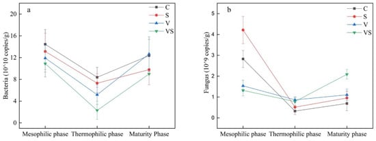 It could be seen from Figure 4 that the overall change trend of the total amount of bacteria in the compost pile was opposite to the change of temperature. The maximum copies of bacterial 16S rDNA fragments were obtained in the mesophilic phase. This result was consistent with the high-throughput sequencing analysis data. The mesophilic phase was rich in organic substrate and the degradable organic matter could be utilized by various microorganisms. Meanwhile, the temperature was appropriate for metabolism in the mesophilic phase, so the miscellaneous bacteria could also grow and breed. Therefore, the sanitary conditions and safety of the composting products could not meet the standard. Due to the effect of high temperature, the copy of bacterial gene fragments significantly decreased in the thermophilic phase. For example, in the VS group, the number of fragments decreased by almost 82%. Most bacteria could not resist high temperatures, and only some bacteria with strong stress resistance could form spores and enter the dormant state during thermophilic phase. Comparing each experimental groups, a higher the temperature corresponded with a lower the copy of bacterial fragments in the thermophilic phase, indicating a more preferable sanitary condition of the fertilizer pile. During the mature phase, the number of bacterial fragments recovered to a certain extent, but the overall number was lower than that of the initiation. During the mature phase, the nutrients were relatively sparse, but the temperature was appropriate and there was no interference of miscellaneous bacteria. The surviving microorganisms would grow and reproduce quickly, to further accelerate the maturation of the fertilizer pile and improve the fertilizer.