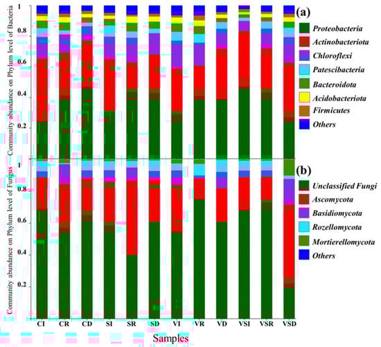 Community abundance at the phylum level of bacteria (a) and fungus (b).