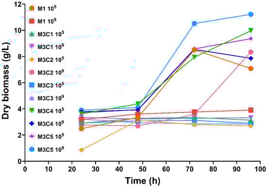 In contrast, the M3C5 109 culture had the highest growth rate, being in the plateau phase at 96 h, and had the highest amount of dry biomass (11.22 g/L). The M3C5 105 culture, inoculated with 105 CFU/mL, was also in the plateau phase at 96 h and, as expected, had a much smaller biomass amount (9.36 g/L) compared to the culture inoculated with 109 CFU/mL. In conclusion, comparing all the obtained results for fermentations in culture media with different concentrations of anthocyanins, we can say that the increase in anthocyanins’ concentration above 1000 μg/mL in the fermentation media had a stimulating effect on the biomass growth of this LAB strain, while very low anthocyanins’ concentrations had inhibitory effects.