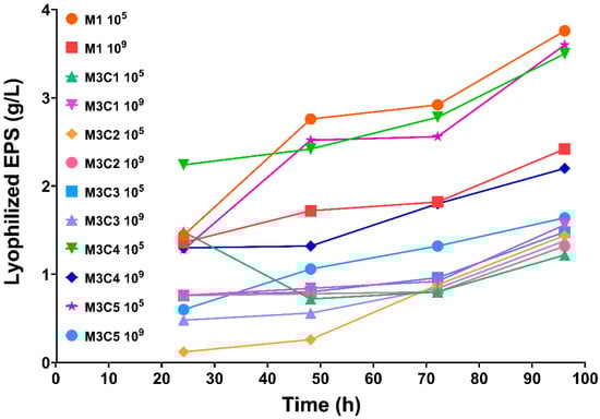 We found that EPS biosynthesis was different compared to biomass growth, as expected, considering that EPS are secondary metabolites. For EPS biosynthesis, microbial cells use up to 70% of their energy stores [20], a fact that is obvious for the control samples, where we quantified the highest amount of EPS (3.76 g/L) for the experiment inoculated with 105 CFU/mL. The difference between the two control experiments was substantial, confirming that when there is more CFU/mL, the consumption of nutrients for cell development is much higher, and EPS biosynthesis decreases significantly at 2.42 g/L (Figure 2).