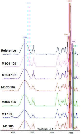 FTIR was used to investigate the nature of the EPS’s functional groups after enzyme inactivation and extraction from culture media. Figure 3 shows the FTIR spectra recorded for the representative samples compared with the standard Dextran spectra. Polysaccharide structural information related to monomeric units and their linkages can be evidenced. Thus, dextran synthesised in the MRS by Weissella spp. strain fermentation (105 and 109) was evidenced by the presence of a sharp peak at 1012 cm−1 and 1016 cm−1, respectively, which is characteristic of the α-(1→6)-glycosidic bond of dextran. Peaks at 916.1 and 840 cm–1 region, specific for α-(1→3)-glycosidic bond were also recorded [35]. The absorption peak at 758 cm−1 indicates that the configuration should be a pyran ring. The peak at 1103 cm−1 should be ascribed to the vibration of the C-O bond at the C-4 position of a glucose residue and the peak at 1149 cm−1 is ascribed to the exocyclic C-O stretching vibrations. The broad peak obtained at 3350 cm−1 is associated with the stretching vibration of the O-H groups present in the polysaccharide chain, while the peak recorded at 2920 cm−1 is due to the stretching vibration of the C-H bonds. The above-mentioned peaks were recorded and marked for all studied samples (Figure 3).