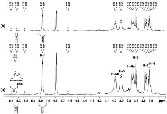 The overlap of the 1H NMR spectra corresponding to the two analysed samples (a) M3C4 and (b) M3C5, recorded in D2O with water signal suppression. The signals’ assignments are annotated in the figure.