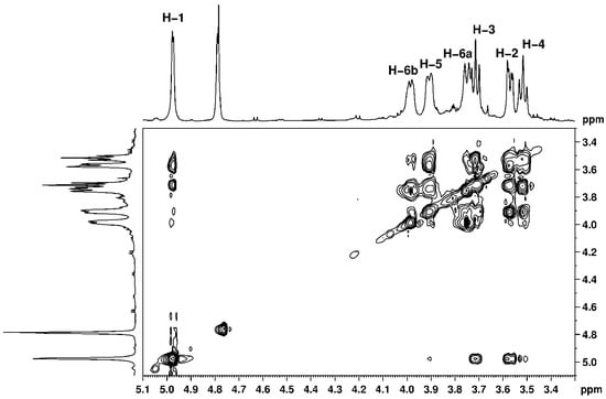 Dextran’s main chain consists mainly of α-(1→6)-linked glucose units that are associated with the most intense signals in both proton and carbon NMR spectra of our samples. Starting from the anomeric proton that resonates at 4.97 ppm, the assignments for the rest of the α-glucopyranose protons were performed from the TOCSY experiment. Thus, in the TOCSY spectrum exemplified in Figure 5 for sample M3C4, one can observe the couplings of the H-1 anomeric proton from 4.97 ppm (doublet with coupling constant 3 Hz) with protons that belong to the same spin system, such as: H-2 from 3.57 ppm (doublet of doublets with coupling constant 10 and 3 Hz), H-3 from 3.71 ppm (triplet with coupling constant 10 Hz) and H-4 from 3.52 ppm (triplet with coupling constant 10 Hz) protons. Another spin system identified in TOCSY is formed by H-5 from 3.90 ppm (doublet with coupling constant 8 Hz) with H-6 from 3.75 ppm (doublet with coupling constant 10 Hz) and 3.98 ppm (doublet with coupling constant 7 Hz).