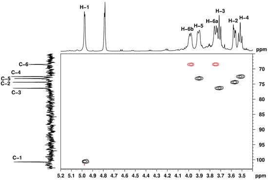 The diastereotopic nature of the two protons from the methylene group is clearly visible in the multiplicity-edited HSQC spectrum, exemplified in Figure 6 for sample M3C4. In this type of experiment, the correlation signals associated with the proton-carbon direct chemical bond are “phase coded” depending on the number of hydrogen atoms attached to a given carbon atom. Thus, the signals for CH and CH3 groups have the same phase, while those for CH2 groups have an opposite phase. In the multiplicity-edited HSQC spectrum exemplified in Figure 6, the methylene group was straightforwardly identified based on the negative phase (colour code red in Figure 6 of the corresponding correlation signal). Indeed, the phase difference, another characteristic can be observed in the HSQC spectrum, namely, for the same carbon (68.5 ppm) there are two different signals in the proton dimension at 3.75 and 3.98 ppm. In general, this pattern present in an HSQC-type experiment indicates the existence of diastereotopic methylene protons. From the same HSQC experiment, the rest of the glucose’s carbon atoms were assigned at the following chemical shifts: 72.5 (CH-4), 73.2 (CH-5), 74.4 (CH-2), 76.4 (CH-3), and 100.7 (CH-1).