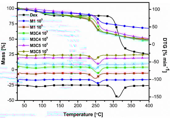 The studied samples’ thermal degradation curves are presented in Figure 7 and the degradation temperatures are listed in Table 3. Up to 400 °C, dextran records two degradation steps [37]. The first step is recorded in the range of 80–100 °C due to the loss of intra-molecularly bound water [37]. In the second step, the most pronounced mass loss takes place in the range of 150–400 °C, which is due to the degradation of the dextran macromolecule [37]. For our samples, the more stable structure is recorded for the Dextran standard, for which the main degradation of the structure was recorded at 312 °C.