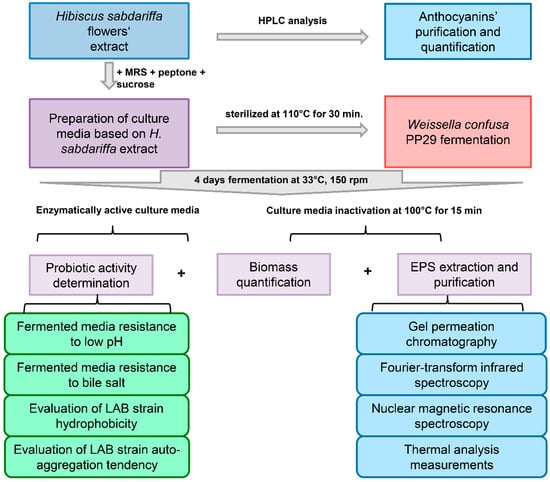 Based on previously published reports stating that consumption of plant polyphenols decreases the incidence of certain chronic diseases [24], in the present study we aimed to obtain a fermented probiotic product that contains EPS produced by W. confusa PP29 as a possible prebiotic substrate, in a culture media with different concentrations of anthocyanins extracted from H. sabdariffa L. flowers. The culture media was supplemented with peptone as nitrogen source and with sucrose as carbon source in order to stimulate the EPS biosynthesis. The fermentations were monitored for four days by quantifying the biomass and EPS yields. The extracted and purified EPS were chemically characterized by using gel permeation chromatography (GPC), Fourier-transform infrared (FT-IR) and nuclear magnetic resonance spectroscopy (NMR), and thermal analysis (TG/DTG) techniques. The probiotic properties of complete culture media were determined by customary methods for quantifying low pH and bile salt resistance, hydrophobicity, and auto-aggregation capacity. The experimental flow is summarized in Scheme 1, which includes all the experimental stages as well as the characterization techniques used.