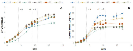 Growth comparison based on (A) Dry weight and (B) Number of cells of six Chlorellaceae spp. strains: C. vulgaris NIES 227 and CCALA 256 & 269, C. sorokiniana NIES 2173, P. kessleri (CCALA 251 & 253). Dashed line denotes the onset of N (-N), P (-P) and S (-S) starvation (except for CCALA 269, for which N depletion occurred on day 7).