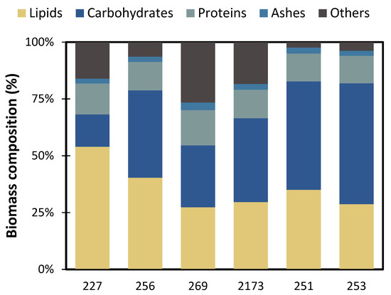Mineral and trace element levels also vary among microalgae (2–20%) depending on the specific metabolic requirements and the availability in the mediums [38,39]. This ash fraction of the feedstock could later on interfere during the biomass conversion to biocrude and its further upgrading, and it could cause damage to the combustion system [40]. Remarkably, a low ash content of 2.2–3.3% was found in the final biomass of the strains (Figure 2). A comparison between conversion of a low-ash and a high-ash microalgal biomass showed the preference for a lower ash content biomass, as the high-ash biomass reduced the conversion efficiency [41].