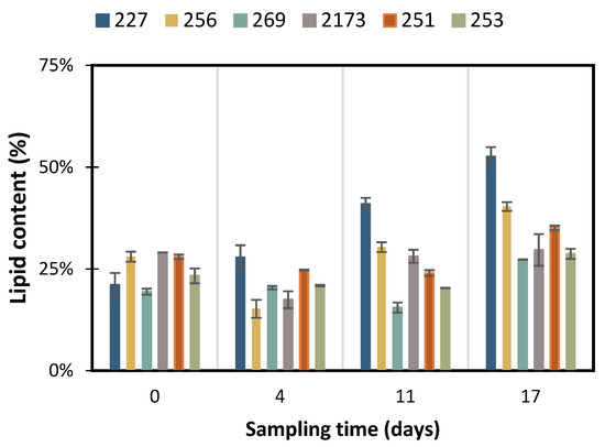 After almost two weeks of N-starvation, the prolonged metabolic stress triggered the accumulation of storage compounds, such as lipids and carbohydrates, at different levels, depending on the strain (Figure 2). Each strain presented a different biochemical and lipid profile, even among the same species of Chlorellaceae. showing potential and diversity. In general, all strains had a higher lipid content compared to the 10–20% found in nutrient sufficient conditions (data not shown). Notably, different lipid accumulation patterns could be observed among the microalgae (Figure 3). NIES 227 had the earliest trigger for lipid accumulation and a continuous lipid increase since the onset of N-starvation. On the opposite side, for the strains CCALA 251 and 253, lipid biosynthesis was triggered after almost two weeks of N-starvation. The highest lipid contents were observed in NIES 227 and CCALA 256 with 54% and 40%, respectively (Table 1). Although NIES 227 had only moderate biomass productivity, this strain significantly surpassed the lipid productivities of all the tested strains with a value of 212 mg/L/day, compared to CCALA 256 and NIES 273 with 156 and 149 mg/L/day. The reduced lipid content observed in some strains coincided with a preference for carbohydrate storage. Four of the strains had a carbohydrate content of at least 35%. The highest carbohydrate content was found in both P. kessleri strains, CCALA 251 and 253 with 48% and 53%, respectively. NIES 227 had the lowest carbohydrate content with 14%. During nutrient limitation, total carbohydrates can reach up to 55% of the biomass dry weight [28].